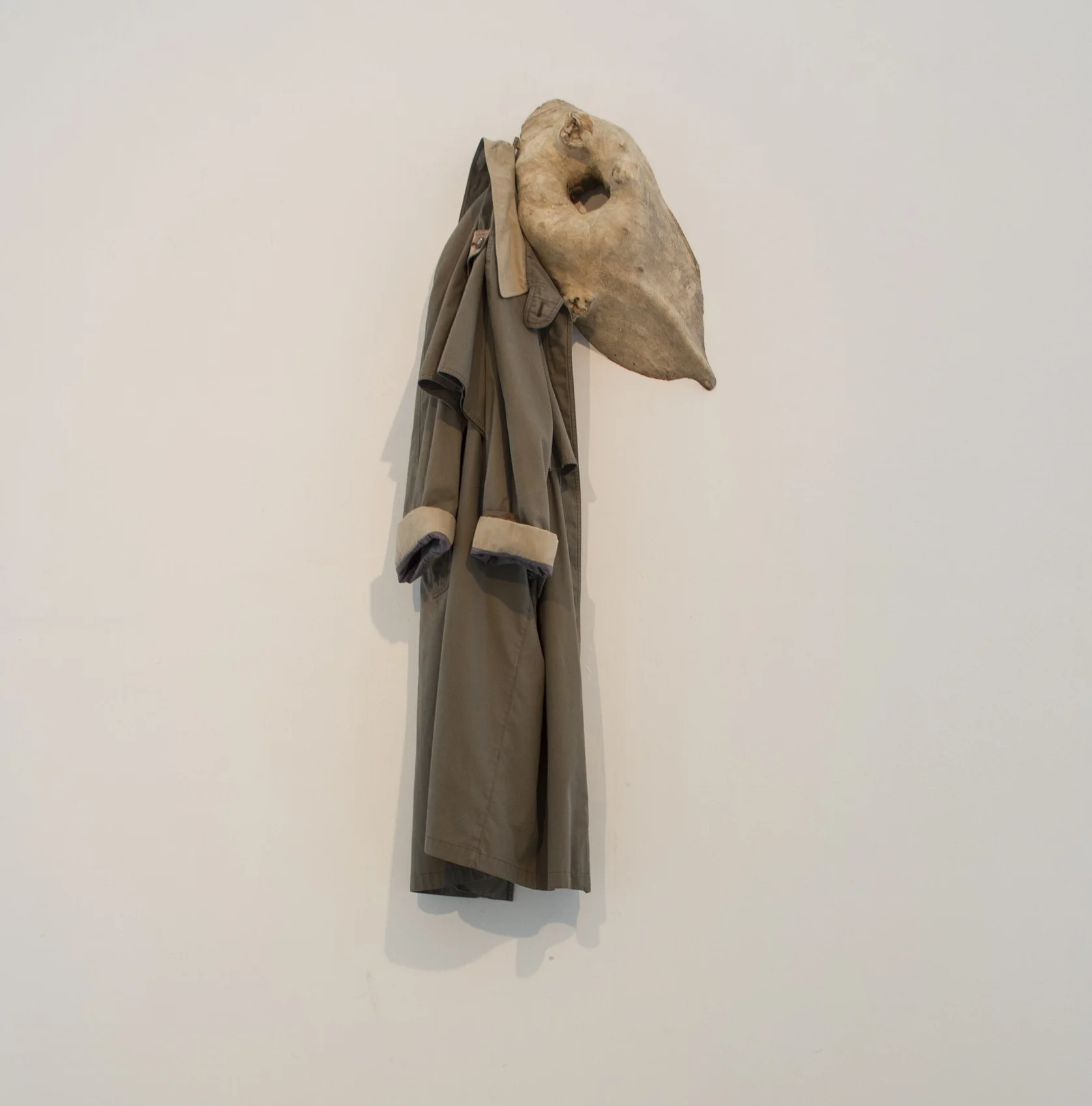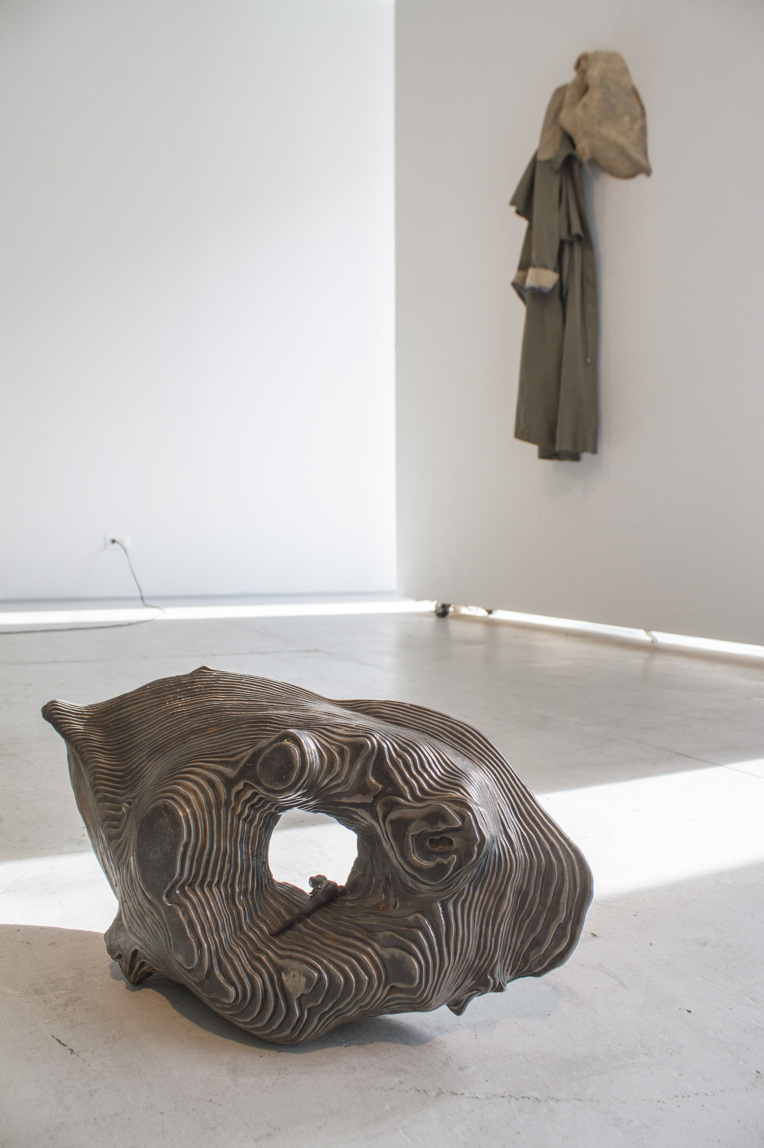 The Mussel Makes the Shell is an Ash burl off-cut from a forestry reclaim mill in Indiana that was scanned into CAD software, mapped into layers, cut out of mild steel with a plasma CNC, and plug welded into a replica topography. The Mussel Makes the Shell was produced for for no space at the Chicago Artist’s Coalition in 2016. The coat was hung to counter balance wood while the wax salamander was left to slowly melt as the steel warmed in the sun for the month long duration of for no space.