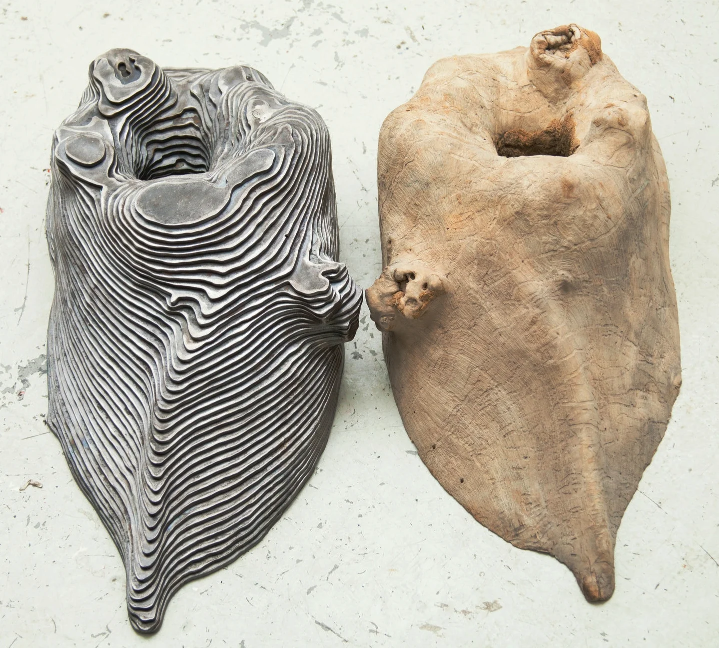 ash burl scarred by emerald ash bore beetles, trench coat, mild steel, foundry wax