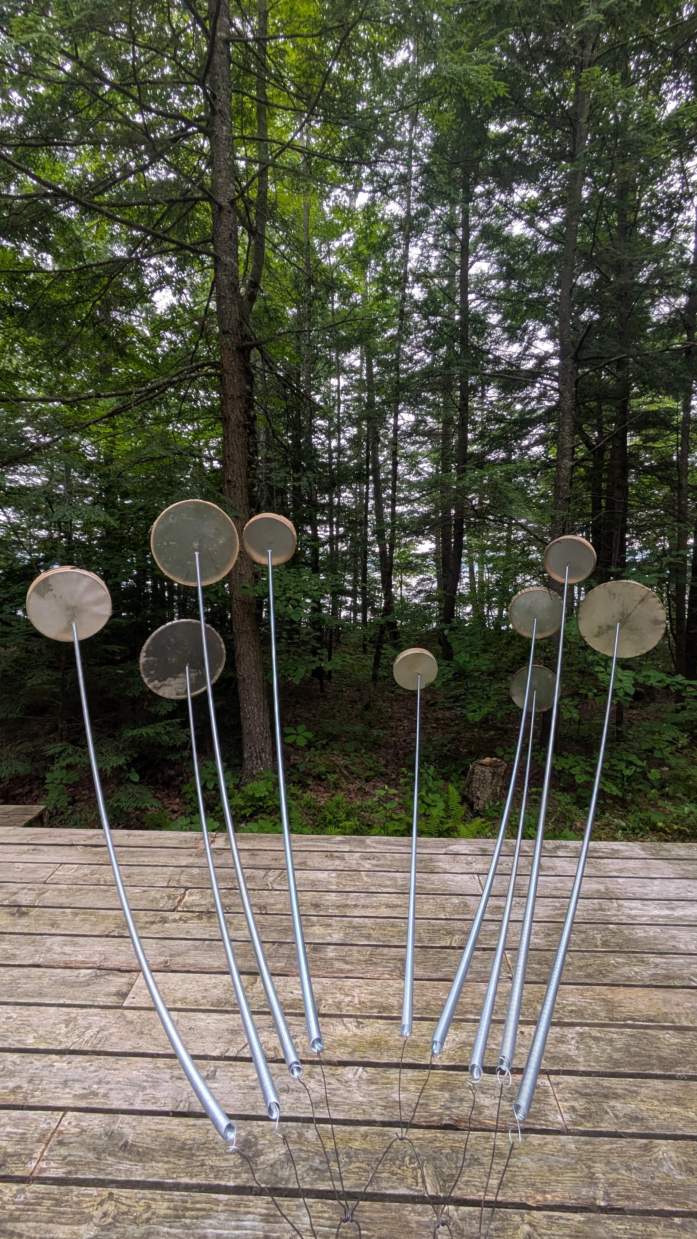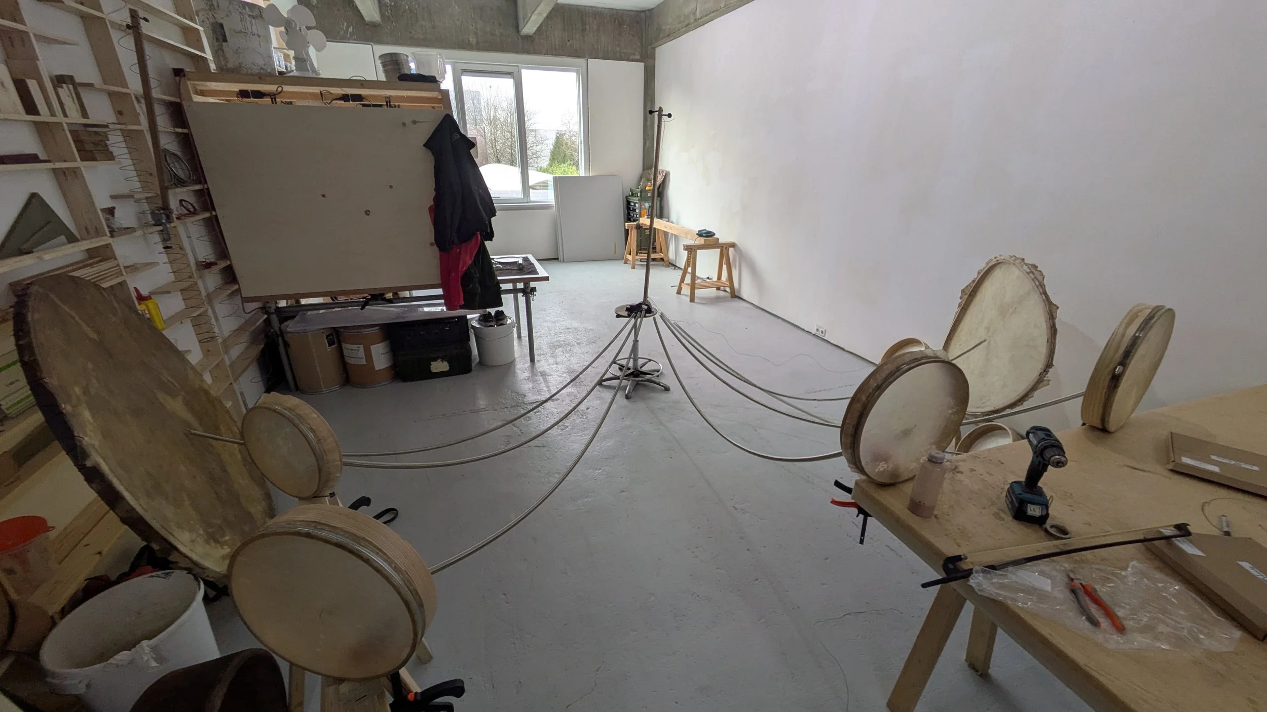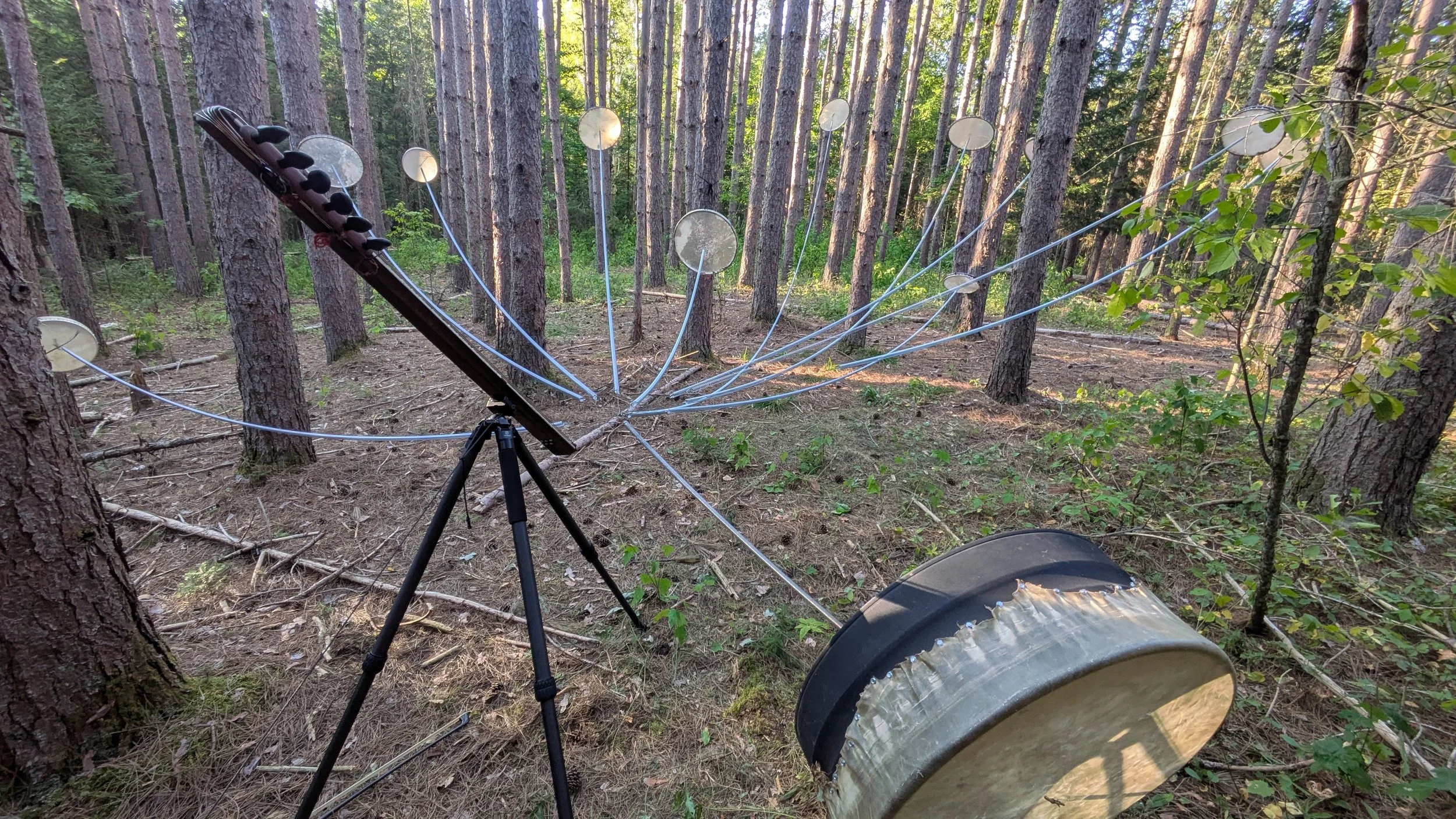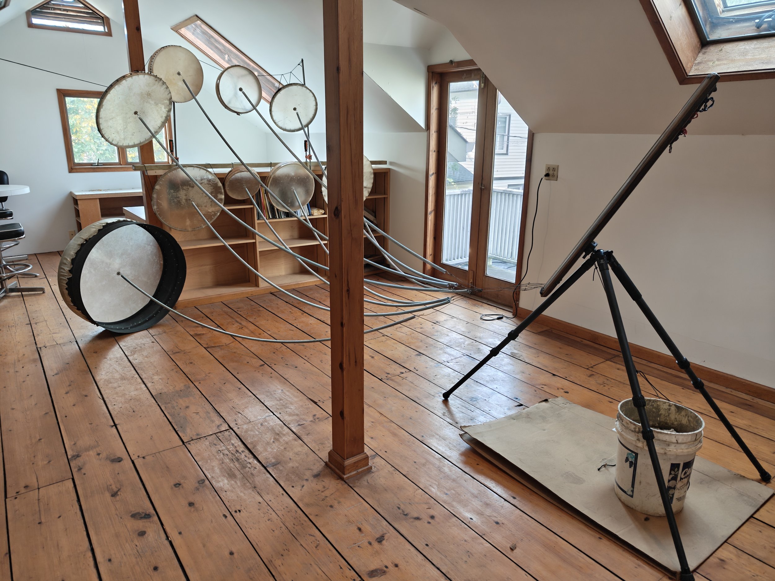 When I first began experimenting with Görkem’s invention I found myself most interested in this quality of expansive noise, wondered how big it could get, and began developing a new branch of the Yaybahar’s evolving tree. While Görkem’s intruments prioritize consistency and precision, the Yaybahar system I’ve been developing prioritizes the chaos and imprecision. I employ springs of random lengths, drums of random tensions, and (at the moment) six playable strings and up to 20 resonating drums. I rig the drums to the the architecture of chosen performance sites, resulting in a unique sound profile each time the system is installed. Since each spring I employ is a random length, the time it takes vibrations to travel varies, and the result is a wash; A-rhythmic, chaotic, and in constant pursuit of harmonic overtones and fleeting syncopations. Meanwhile, since each uniquely sized drum is arbitrarily tensioned, the result is a searching tonal consistency that travels around the hosting space. I have nicknamed my Yaybahar build, in its current form, the helper. Less of a precision tool, more of a sound sculpture, the helper Yaybahar is not intended to be fixed or finished. It’s form, material composition, sound profile, playable quality, affect in space, and sub-name will all likely change as its system evolves.