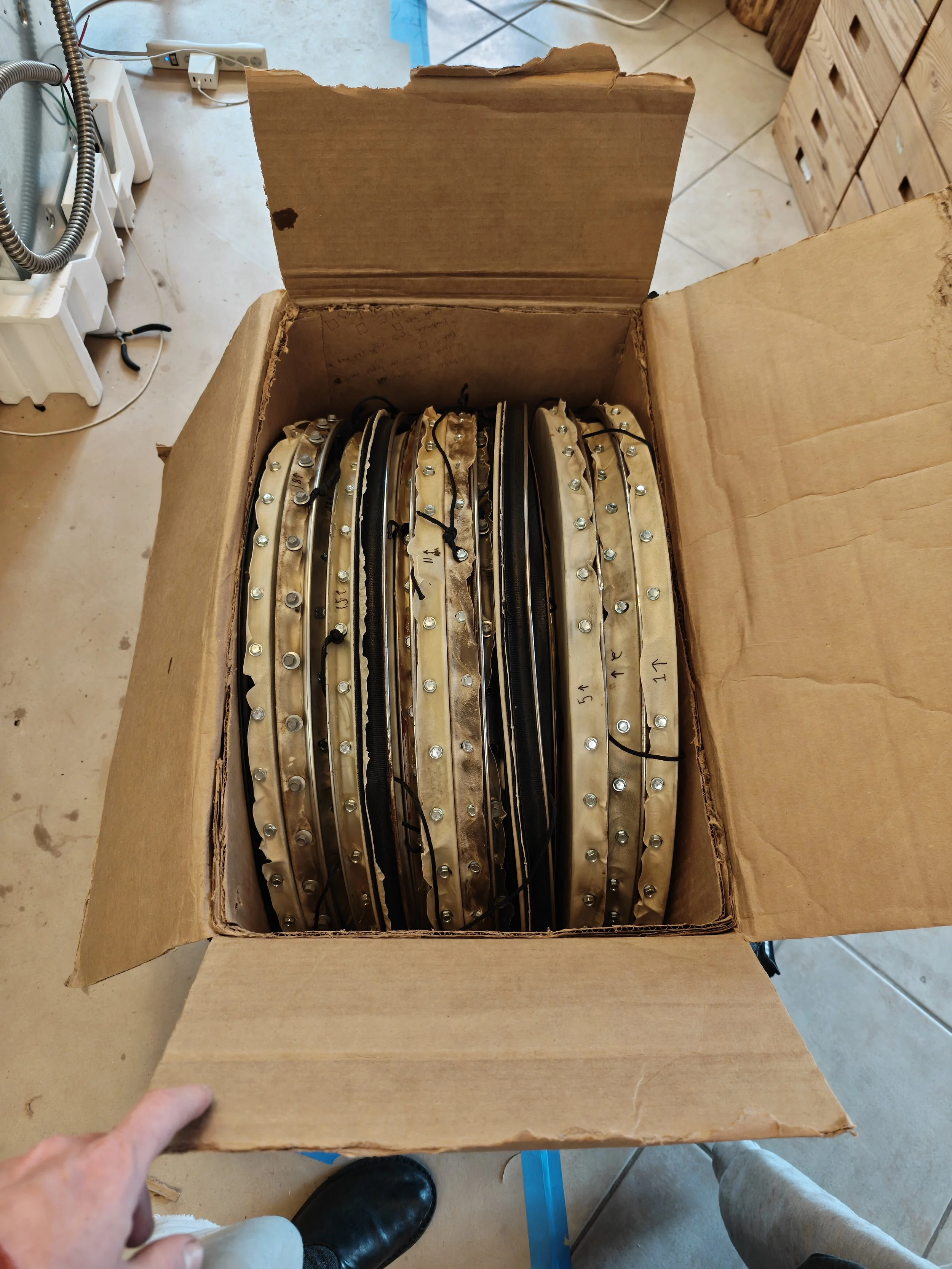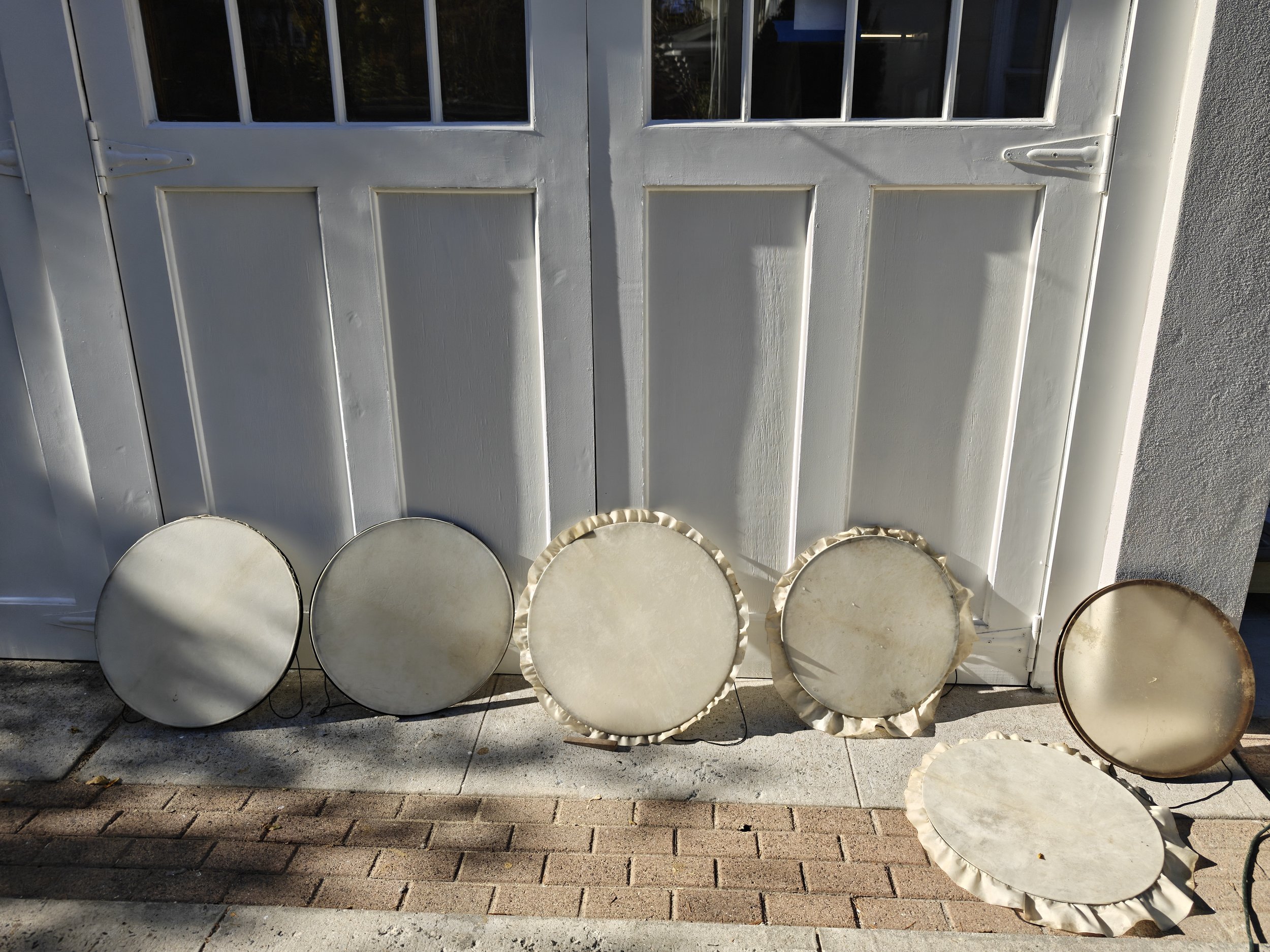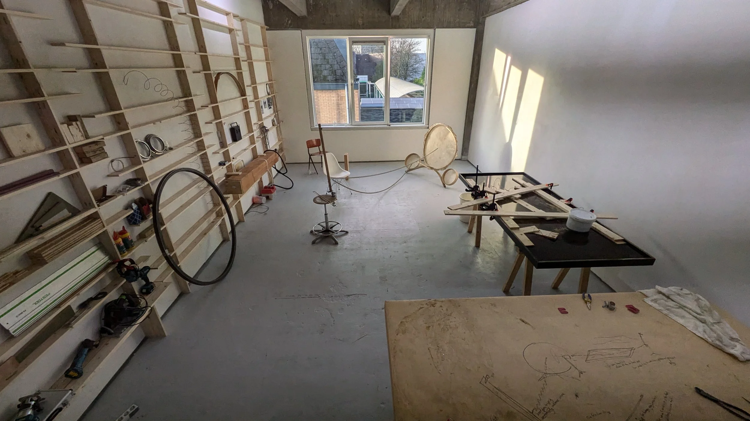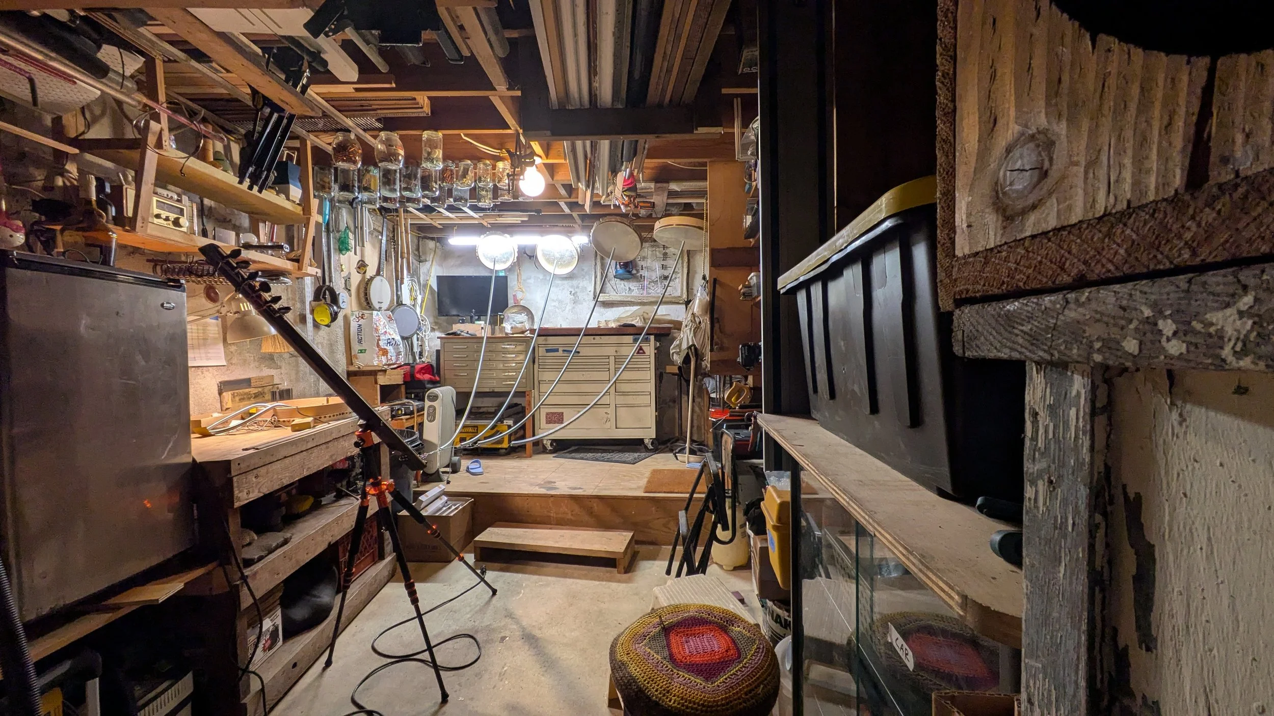 When I first began experimenting with Görkem’s invention I found myself most interested in this quality of expansive noise, wondered how big it could get, and began developing a new branch of the Yaybahar’s evolving tree. While Görkem’s intruments prioritize consistency and precision, the Yaybahar system I’ve been developing prioritizes the chaos and imprecision. I employ springs of random lengths, drums of random tensions, and (at the moment) six playable strings and up to 20 resonating drums. I rig the drums to the the architecture of chosen performance sites, resulting in a unique sound profile each time the system is installed. Since each spring I employ is a random length, the time it takes vibrations to travel varies, and the result is a wash; A-rhythmic, chaotic, and in constant pursuit of harmonic overtones and fleeting syncopations. Meanwhile, since each uniquely sized drum is arbitrarily tensioned, the result is a searching tonal consistency that travels around the hosting space. I have nicknamed my Yaybahar build, in its current form, the helper. Less of a precision tool, more of a sound sculpture, the helper Yaybahar is not intended to be fixed or finished. It’s form, material composition, sound profile, playable quality, affect in space, and sub-name will all likely change as its system evolves.