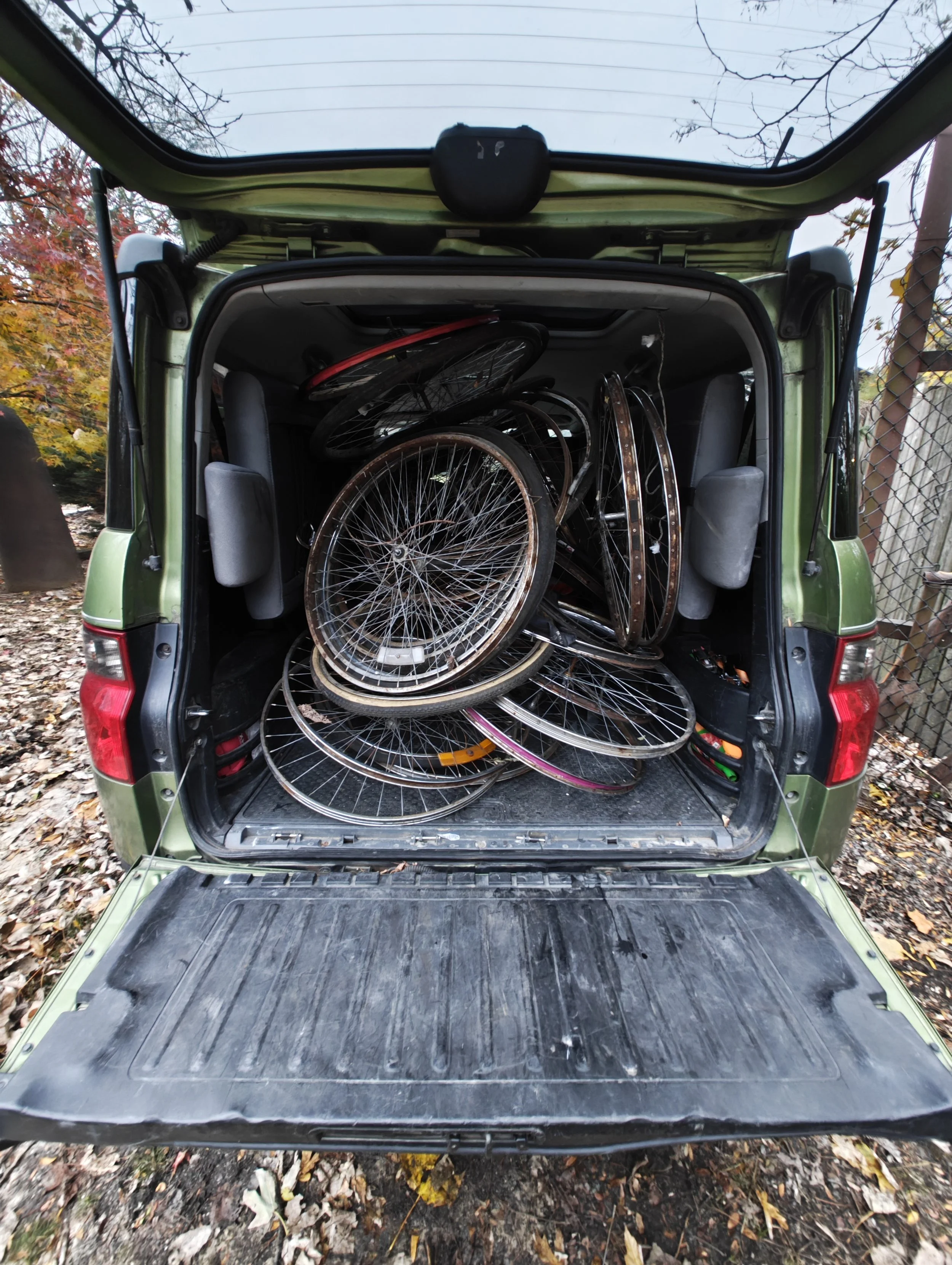 rope, bicycle rims, self tapping screws, cow skin, clevis pins, washers, stainless steel springs, mild steel wire, carved smoked oak, whitner tuning pegs, double bass strings, tripod, hardware